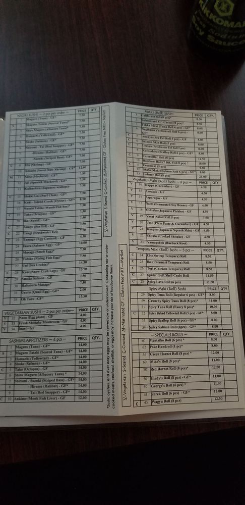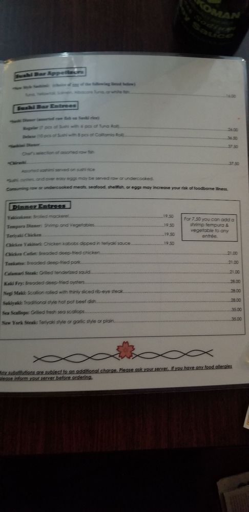Sushi, oysters, and over easy eggs may be served raw or undercooked. Consuming raw or undercooked meats, seafood, shellfish, or eggs may increase your risk of foodborne illness.